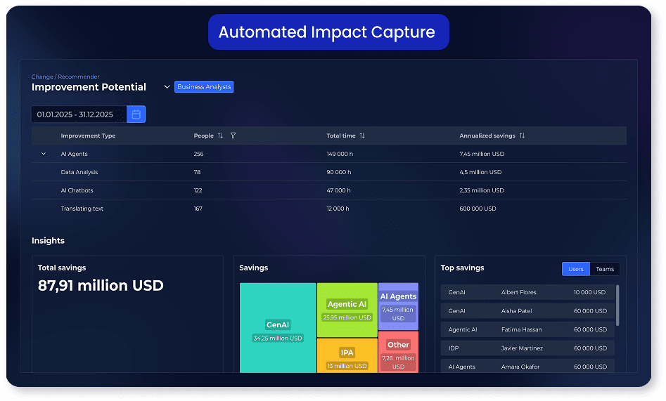 Apply Machine Learning (ML) to your data and receive specific use cases, broken down by the highest-impact potential in terms of time, FTE, or costs, helping experts focus on what matters most to the enterprise.