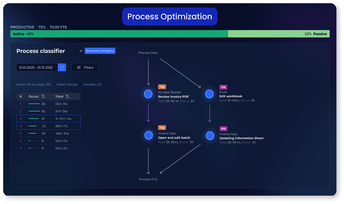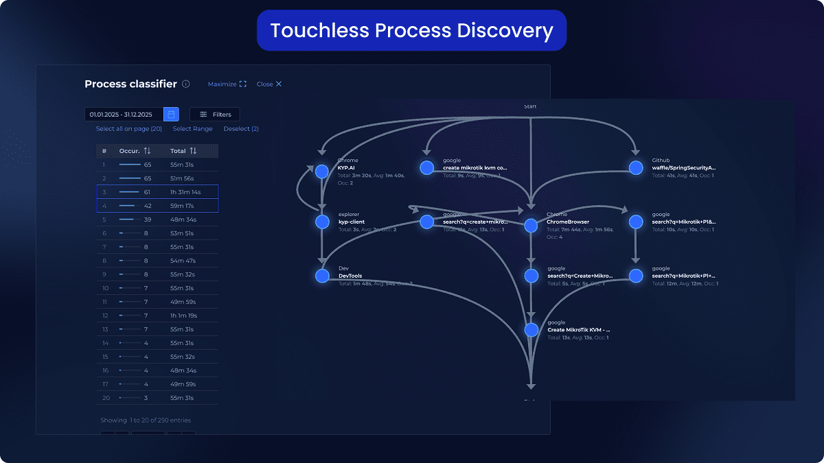 KYP.ai automatically discovers and captures processes, providing you with actionable insights and complete Standard Operating Procedures (SOPs)—so you can focus on productivity optimization, not documentation.