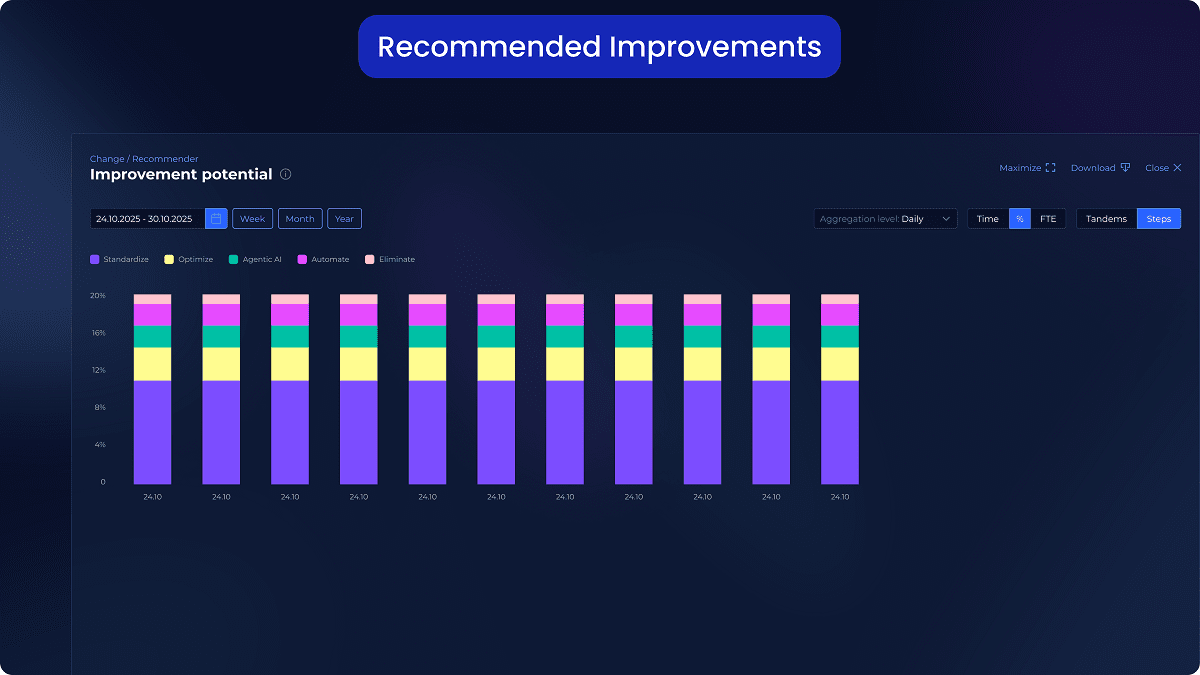 Let AI analyze improvement areas and monitor progress automatically. Apply insights across departments without adding overhead or relying on consultants.